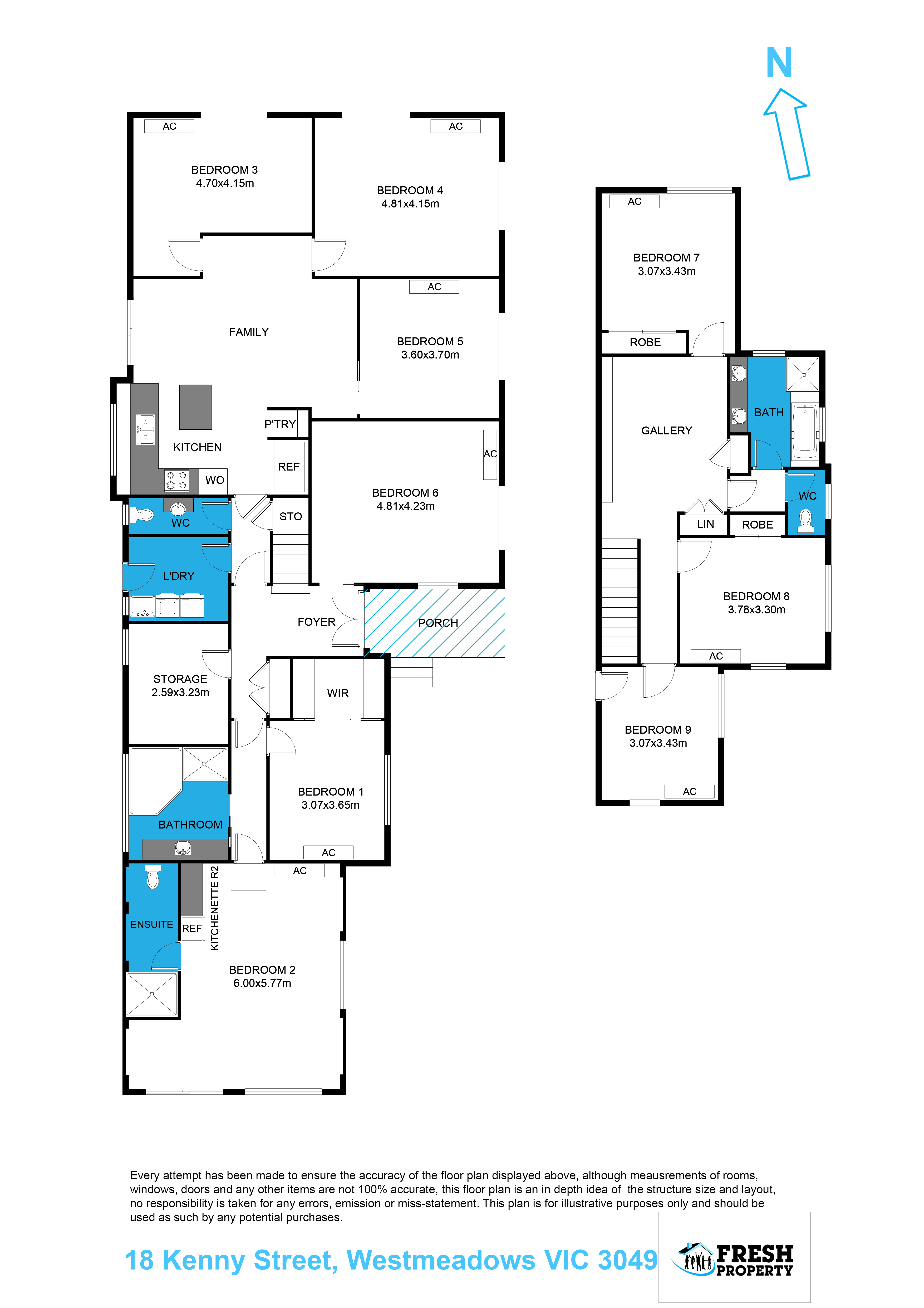 – Total of 3 bathrooms and 3 toilets (One is an ensuite in room 2)