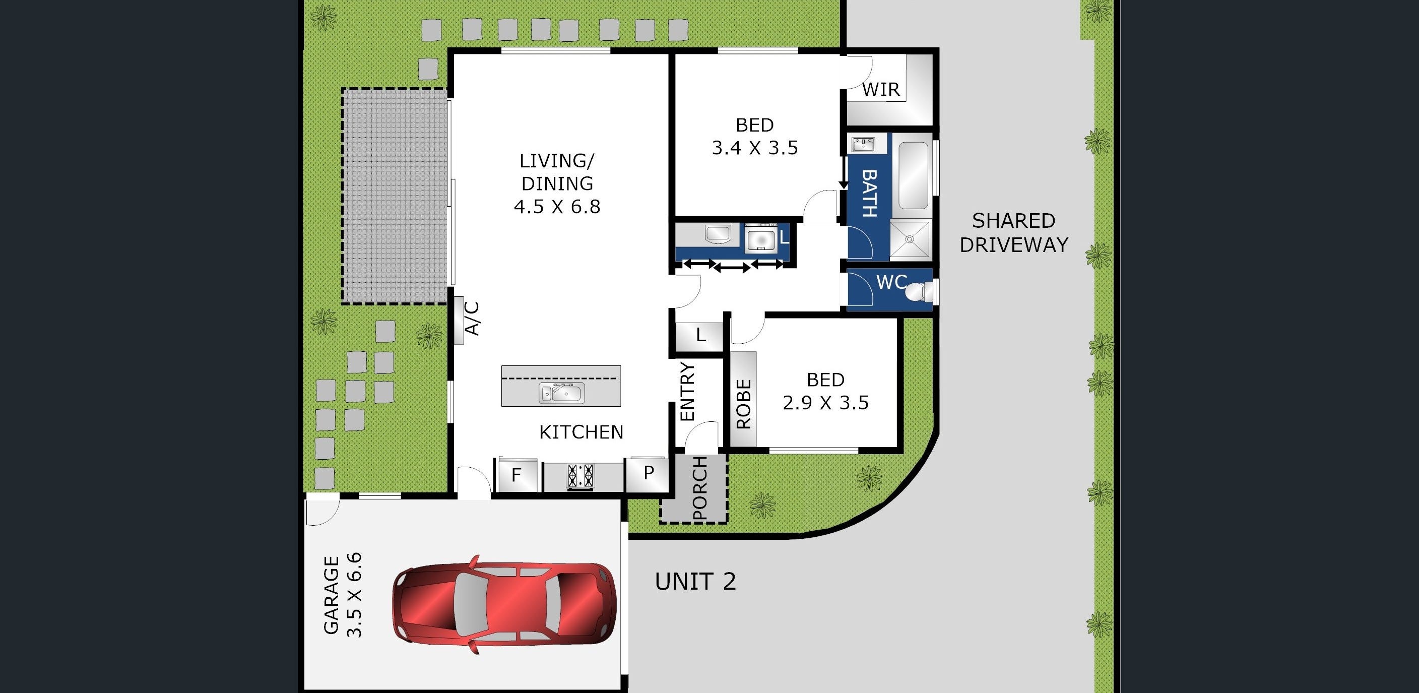 • 2 spacious bedrooms with a walk in robe in the Main bedroom and built-in robes in the second